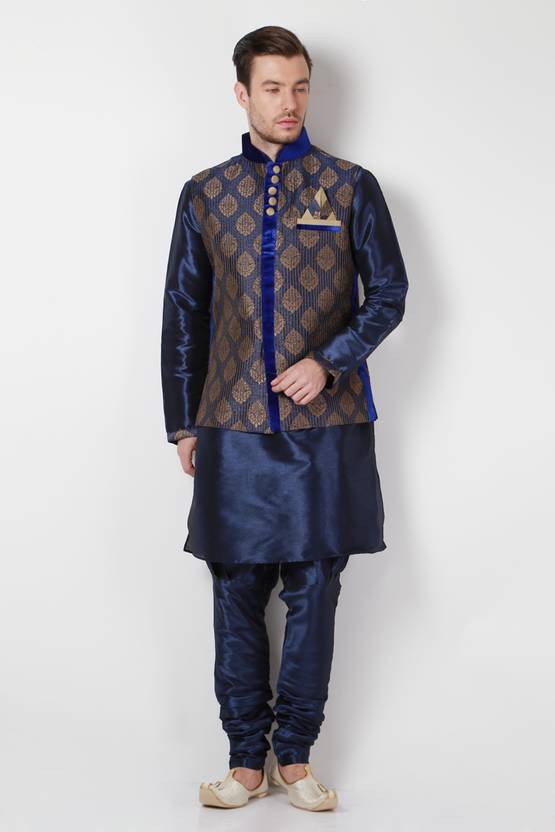 Wear this intricately designed navy kurta, pyjama and waistcoat set from Peter England to garner compliments at your next social gathering. This set includes a kurta with a band collar, long sleeves and vented hems, a jacquard nehru jacket with a woven design and a full button placket and a pair of pyjamas. Style it with a pair of mojaris to make heads turn.