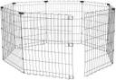 This portable pet play and exercise pen is perfect for indoor and outdoor use, designed for dogs up to 20 inches tall. Made of durable iron metal with a rust-proof black finish, it features 8 connected panels creating a 16-square-foot enclosure. Easy to set up without tools, it folds flat for storage. Includes 8 ground anchors for outdoor use and comes with a 1-year limited warranty for peace of mind.