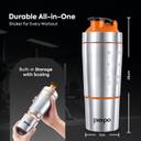 The Pexpo Kinetic Stainless Steel Gym Shaker is designed to provide both convenience and reliability for anyone leading an active lifestyle. Made from high-quality, food-grade stainless steel, this 700ml shaker is built to withstand the rigors of daily use. Ideal for mixing protein shakes, pre-workouts, smoothies, or any of your favorite beverages, the Pexpo shaker is designed to make your fitness routine easier and more efficient. One standout feature is its detachable 180ml extra compartment, which offers extra space for storing supplements, powder, or other essentials. This compartment makes it easier to keep everything you need in one place, eliminating the need to carry multiple containers or bags. The extra compartment easily attaches to the bottom of the shaker and can be removed for cleaning or refilling whenever needed, providing more flexibility for your on-the-go needs. In addition to its practical design, the Pexpo Kinetic shaker is equipped with a spring ball for blending, ensuring smooth and efficient mixing. The spring ball helps to break up clumps and evenly mix your drinks, allowing you to create perfectly blended beverages every time. The shaker is also made from BPA-free materials, ensuring that you can enjoy your drinks without worrying about harmful chemicals leaching into your beverage. Additionally, the shaker features a leakproof lid, designed to minimize spills and prevent any mess in your gym bag, backpack, or car. Whether you're running errands, heading to the gym, or out for a hike, you can confidently carry your shaker without the fear of leakage. The Pexpo Kinetic Stainless Steel Gym Shaker combines functionality with style. Its thoughtful features make it a standout choice for anyone looking to streamline their fitness routine while enjoying the convenience of having everything in one compact solution. Whether you're working out, traveling, or just on the go, the Pexpo Kinetic shaker has you covered.