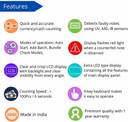 | Key Features | - Fully Automatic, 9-key keyboard makes it easy to operate., Extra Display FREE, Automatically detects faulty/counterfeit notes using Ultraviolet, Magnetic, Infrared sensors., Width variation of notes is detected by Optical sensor., Capable of Double Note detection., Sensitivity of Ultraviolet, Magnetic, Infra-red and Optical sensors are settable., Clear and crisp LCD display with backlight and clear visibility from every angle., It detects various parameters for authenticity of notes and indicates various errors observed., Auto Start, Add Batch, Bundle Check., BEST FEATURE- Machine stops working beyond specific Low/High Voltages, eliminating counting errors and probable damages., Thermal Protection circuit for induction motor.