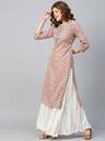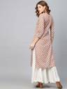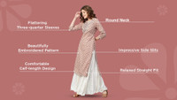 Owing to its round neck, three-quarter sleeves, side slits, and below-the-knee length, this kurta embodies stylish design elements. Also, the round neck offers a classic and versatile neckline, while the three-quarter sleeves strike a balance between sleeveless and full sleeves, making it suitable for different weather conditions. The side slits not only add a contemporary flair but also ensure comfortable movement. Additionally, the below-the-knee length contributes to a modest and graceful appearance.