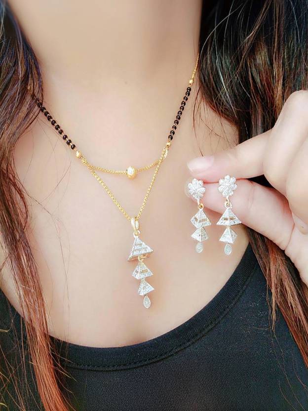 This Beautifully Designed American Diamond Designer Mangalsutra Set Are Made From High Quality Material.Its Atteractive Design Easily Attract Others'Eyes.Women wear it on different occasions. They have special importance on ring ceremony, wedding and festive time as well as regular basis.Keep this product away from sprays and other corrosive liquids for long life. thanks for shopping & share your valuable Ratting! PIHOO ENTERPRISE is committed to provide the best Jewellery and the best customer services to our customers your feedback is our motivations to improve thanks Re PIHOO ENTERPRISE