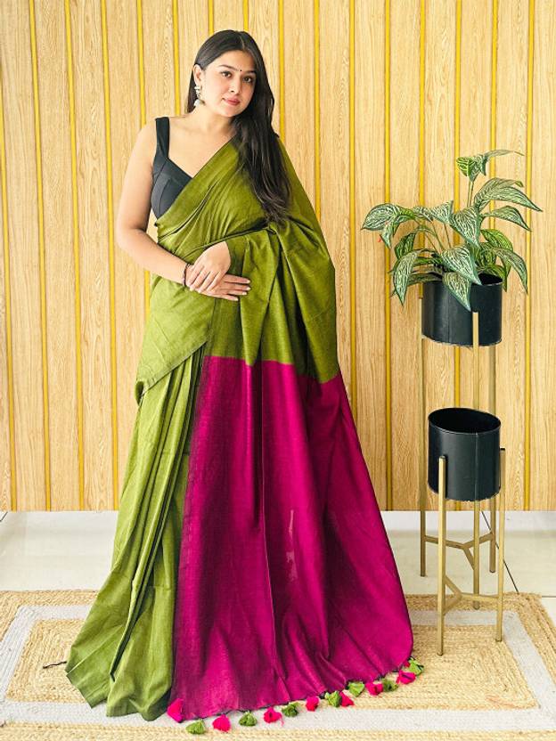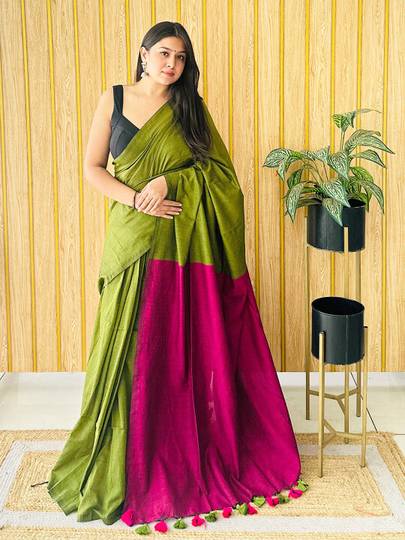 Cotton, Solid saree with contrast border, Tassels, Bengali