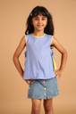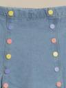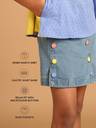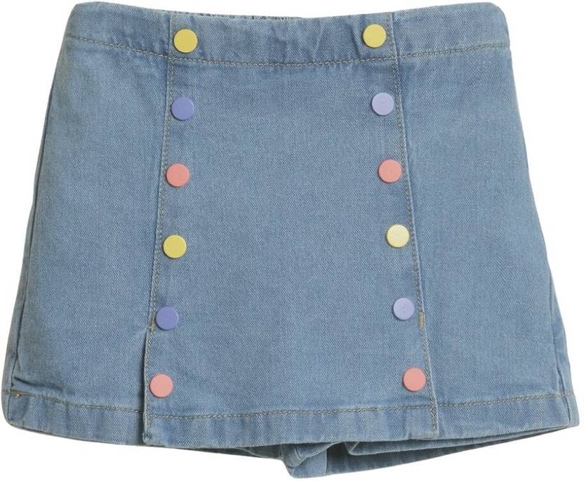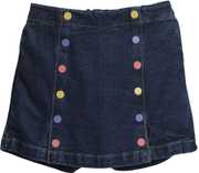 FEATURES 100% cotton twill denim Double layered front panel Different colored buttons Skirt + Shorts = Skorts ! Back elasticated