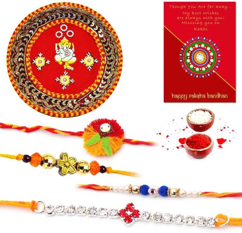 1 Thali, 4 Rakhi,1 Pack Roli & Rice, 1 Greeting Card