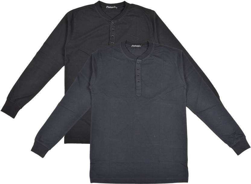 Pintapple Pack of 2 Men Solid Henley Neck Cotton Blend Black T-Shirt