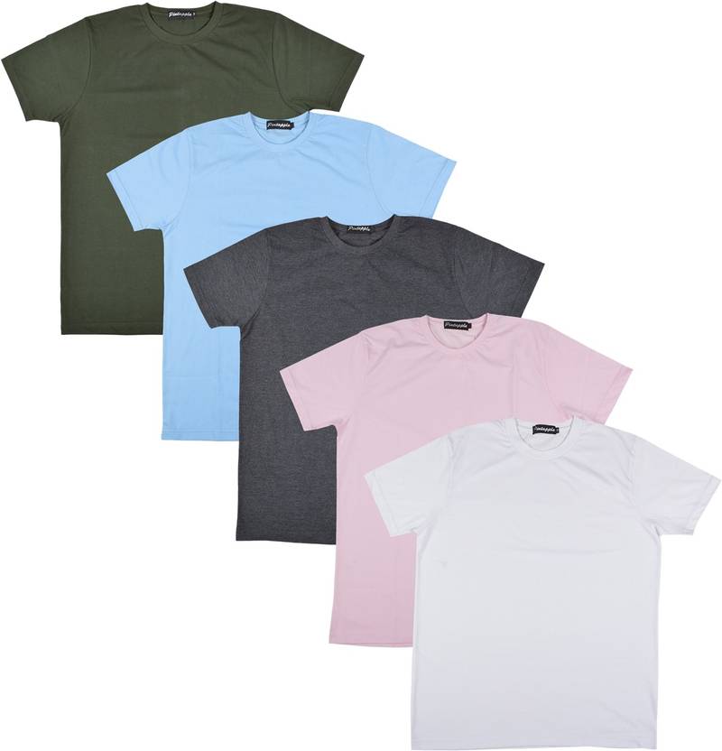 PintappleĀ Pack of 5 Men Solid Round Neck Cotton Blend Light Blue, Dark Green, White, Pink, Grey T-Shirt