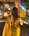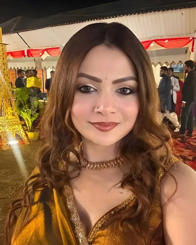 A graceful woman dressed in a stunning golden saree with intricate borders, complemented by soft curls, bold eye makeup, and a subtle nude lip. The traditional choker necklace and nose pin add a touch of charm to her elegant festive look. Perfectly captured under warm evening lights at a celebration.