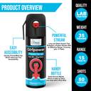Spray nozzle always points towards attacker's face, spray reaching upto 15 ft.