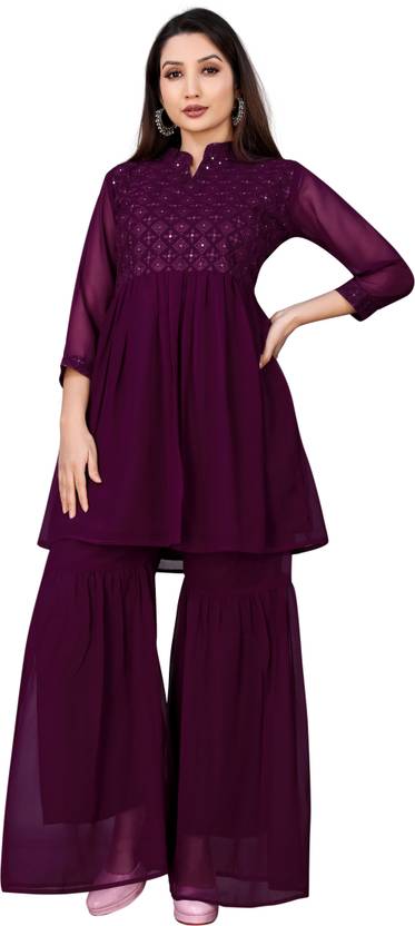 Step into elegance with our ready-to-wear Kurta Sharara set, intricately adorned with sequence embroidery. Perfect for any occasion, this ensemble effortlessly combines timeless tradition with the latest trending design, ensuring you shine with sophistication and style wherever you go."