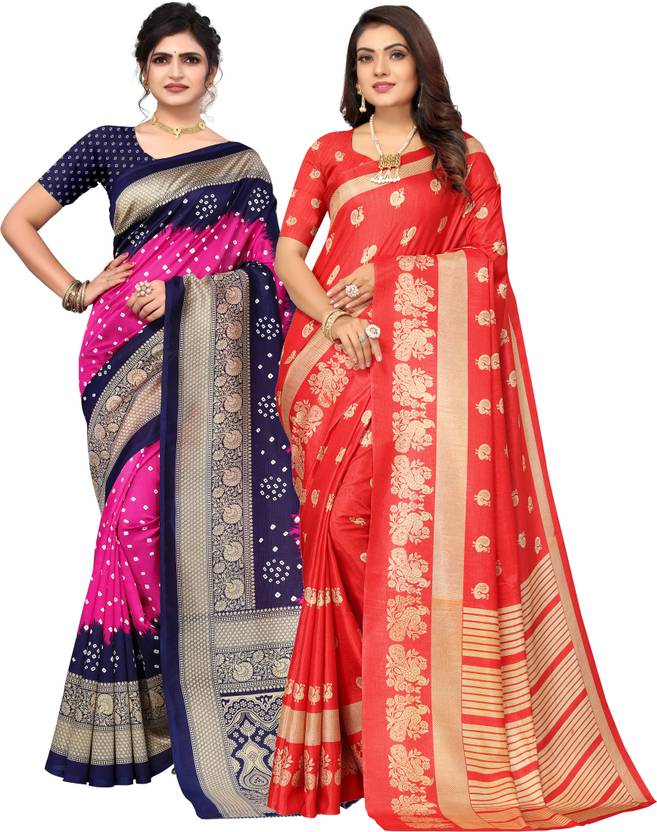 Animal Print Bandhani Art Silk Saree (Pack of 2, Pink, Red)