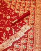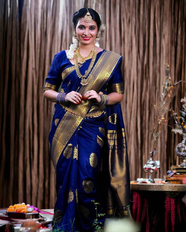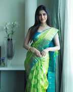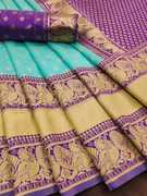 Teal and gold-toned kanjeevaram saree Woven design saree with woven design border Has zari detail. The saree comes with an unstitched blouse piece The blouse worn by the model might be for modelling purpose only. Check the image of the blouse piece to understand how the actual blouse piece looks like. Size & Fit:- Length: 5.5 meters, Material & Care :- Saree Fabric: Silk Blend Blouse Fabric: Silk Blend Dry Clean
