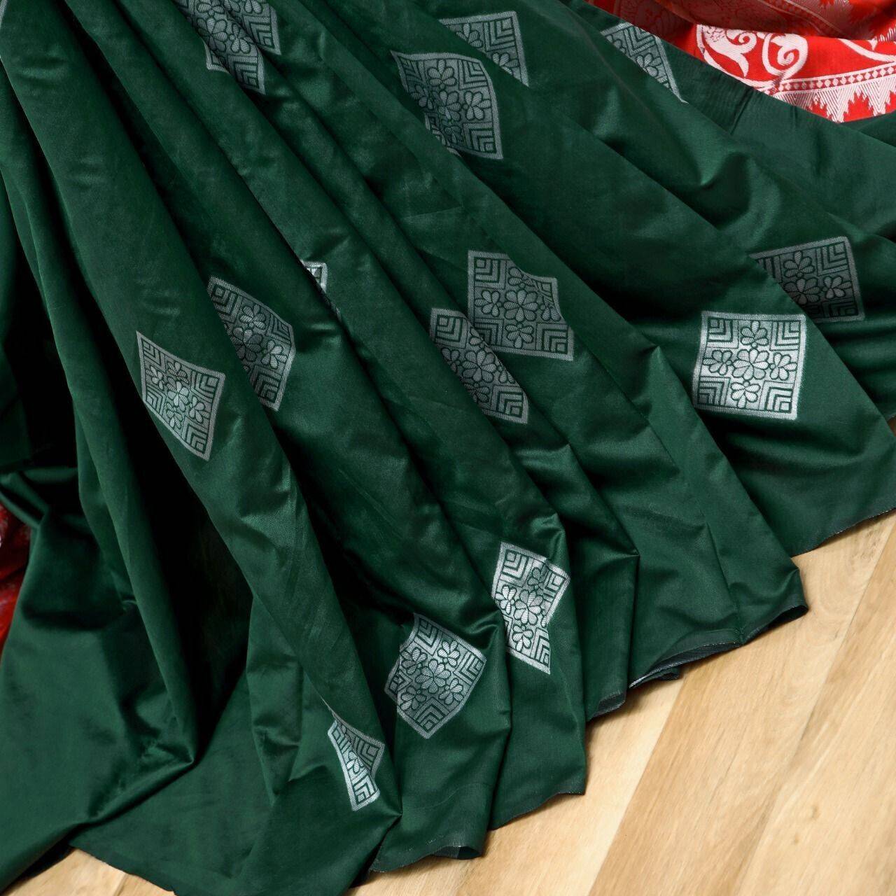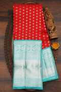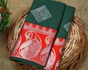 Teal and gold-toned kanjeevaram saree Woven design saree with woven design border Has zari detail. The saree comes with an unstitched blouse piece The blouse worn by the model might be for modelling purpose only. Check the image of the blouse piece to understand how the actual blouse piece looks like. Size & Fit:- Length: 5.5 meters, Material & Care :- Saree Fabric: Silk Blend Blouse Fabric: Silk Blend Dry Clean