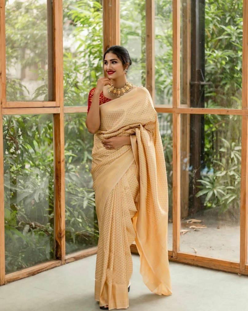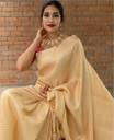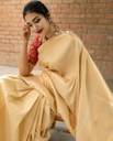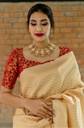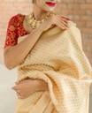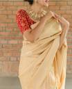 Teal and gold-toned kanjeevaram saree Woven design saree with woven design border Has zari detail. The saree comes with an unstitched blouse piece The blouse worn by the model might be for modelling purpose only. Check the image of the blouse piece to understand how the actual blouse piece looks like. Size & Fit:- Length: 5.5 meters, Material & Care :- Saree Fabric: Silk Blend Blouse Fabric: Silk Blend Dry Clean