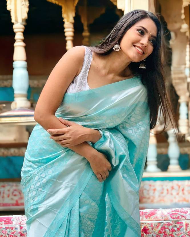 Teal and gold-toned kanjeevaram saree Woven design saree with woven design border Has zari detail. The saree comes with an unstitched blouse piece The blouse worn by the model might be for modelling purpose only. Check the image of the blouse piece to understand how the actual blouse piece looks like. Size & Fit:- Length: 5.5 meters, Material & Care :- Saree Fabric: Silk Blend Blouse Fabric: Silk Blend Dry Clean