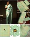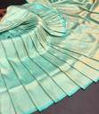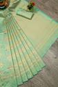 Teal and gold-toned kanjeevaram saree Woven design saree with woven design border Has zari detail. The saree comes with an unstitched blouse piece The blouse worn by the model might be for modelling purpose only. Check the image of the blouse piece to understand how the actual blouse piece looks like. Size & Fit:- Length: 5.5 meters, Material & Care :- Saree Fabric: Silk Blend Blouse Fabric: Silk Blend Dry Clean