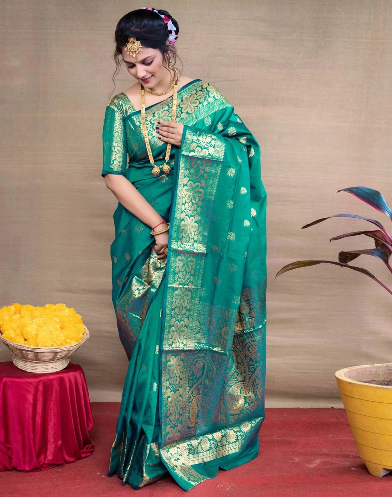 Teal and gold-toned kanjeevaram saree Woven design saree with woven design border Has zari detail. The saree comes with an unstitched blouse piece The blouse worn by the model might be for modelling purpose only. Check the image of the blouse piece to understand how the actual blouse piece looks like. Size & Fit:- Length: 5.5 meters, Material & Care :- Saree Fabric: Silk Blend Blouse Fabric: Silk Blend Dry Clean