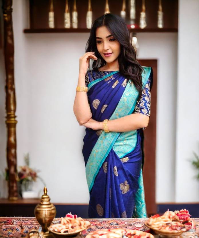 Teal and gold-toned kanjeevaram saree Woven design saree with woven design border Has zari detail. The saree comes with an unstitched blouse piece The blouse worn by the model might be for modelling purpose only. Check the image of the blouse piece to understand how the actual blouse piece looks like. Size & Fit:- Length: 5.5 meters, Material & Care :- Saree Fabric: Silk Blend Blouse Fabric: Silk Blend Dry Clean
