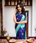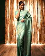 Teal and gold-toned kanjeevaram saree Woven design saree with woven design border Has zari detail. The saree comes with an unstitched blouse piece The blouse worn by the model might be for modelling purpose only. Check the image of the blouse piece to understand how the actual blouse piece looks like. Size & Fit:- Length: 5.5 meters, Material & Care :- Saree Fabric: Silk Blend Blouse Fabric: Silk Blend Dry Clean
