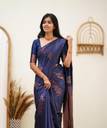 Teal and gold-toned kanjeevaram saree Woven design saree with woven design border Has zari detail. The saree comes with an unstitched blouse piece The blouse worn by the model might be for modelling purpose only. Check the image of the blouse piece to understand how the actual blouse piece looks like. Size & Fit:- Length: 5.5 meters, Material & Care :- Saree Fabric: Silk Blend Blouse Fabric: Silk Blend Dry Clean
