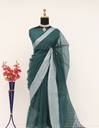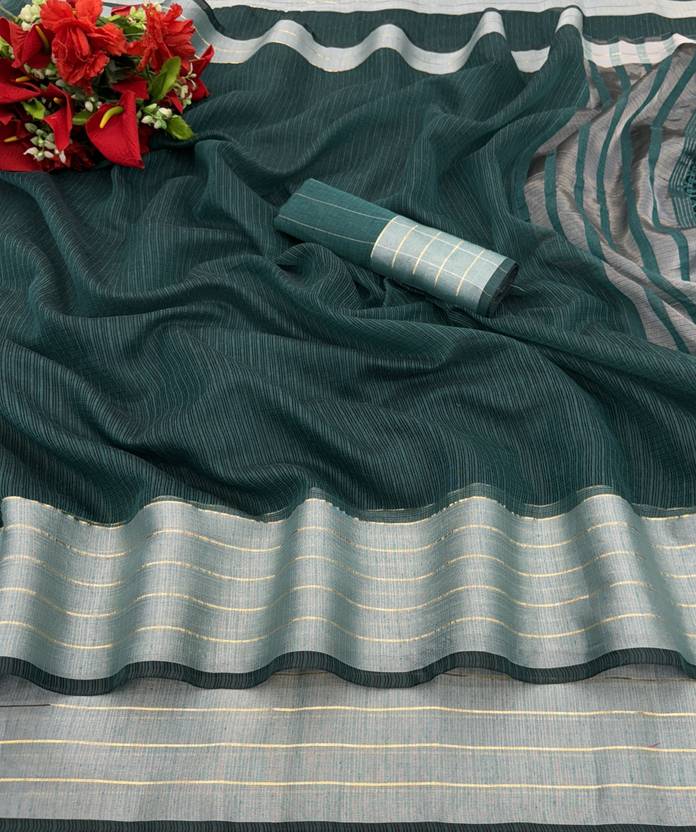 PIYA DESIGNER Solid/Plain Kasavu Cotton Linen Saree (Dark Green, Silver)