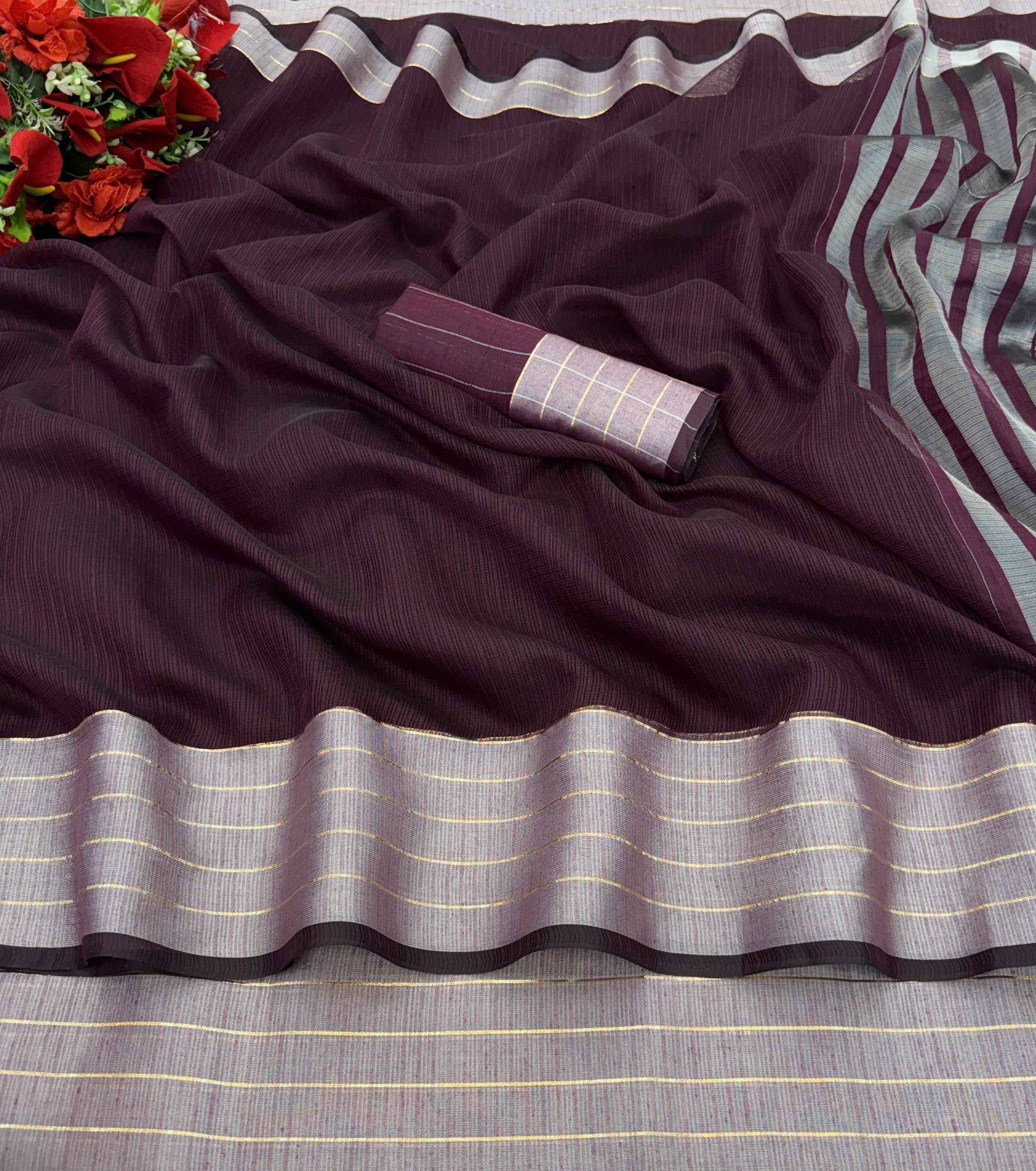 Linen sarees are known for their light and soft fabric. It's the breezy fabric that makes it a favorite during hot summers. It's perfect for the summer season as it is sweat-absorbent and also skin-friendly. It's one of the most superior types of fabric in comparison to other types of fabric.