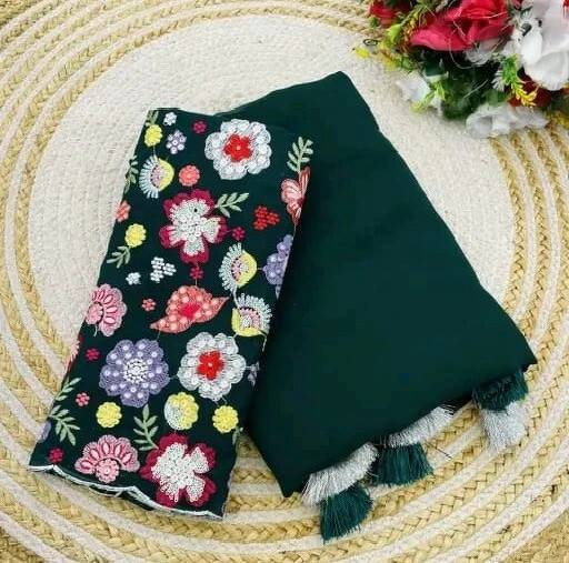 Elevate your ethnic wardrobe with this exquisite Dark Green embroidered sari, a stunning blend of elegance and sophistication. Crafted from pure Georgette, this solid saree drapes beautifully, offering a lightweight and comfortable fit that is perfect for any occasion. The intricate embroidery along the border adds a touch of artistry and charm, making it a standout piece for festive celebrations or formal gatherings. Accompanied by an embroidered blouse, this ensemble ensures a cohesive and stylish look that highlights your grace and poise. Whether paired with traditional jewelry or modern accessories, this black embroidered sari is sure to make a lasting impression, embodying the essence of timeless fashion.