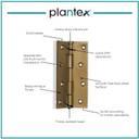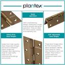 The Plantex Door Hinge Boasts Impressive Technical Specifications, Including A 10 X 3.7 Cm Close Door Hinge, 0.145 Kg Weight, And 4 Inch X 14 Gauge/2 Mm Thickness. Its Durability Is Ensured By Its Virgin Stainless Steel Construction And Rust/Corrosion-Proof Technology, Making It A Long-Lasting Addition To Any Door. The Hinge'S Design Features A 270-Degree Opening, Flush-Mount Csk Screws, And Welded Heads On Both Sides To Support The Single Pin Inside. Its Brass Antique Finish Remains Authentic Over Time, And The Hinge Operates Quietly Thanks To Its Thorough Greasing. With A 7-Way Powder-Coated Technique And High-Strength Steel Composition, The Plantex Hinge Is Versatile Enough To Be Used In Bathrooms, Bedrooms, Store Rooms, Offices, And On Various Door Types. The Package Includes Three Stainless Steel Door Hinges.