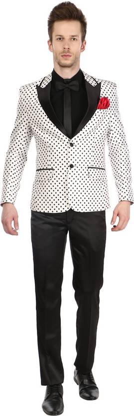 Flaunt an iconic you when you sport this white and black polka printed suit from the fashion hub of Platinum Studio. This tuxedo style suit is made from a high quality imported fabric to keep you at ease and comfort all day long. It can be customized to fit to your length and waist. Perfect to complement your party look, this piece will become your favourite in just no time. The suit includes blazer, trousers, shirt and bow tie.