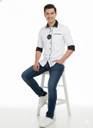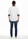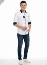 This is a men's full-sleeve red shirt featuring black contrast detailing on the collar, button placket, and cuffs. It has a standard collar and a single chest pocket with black trim. The shirt has a curved hem and appears to have a regular to slim fit. It can be paired with blue or black denim jeans, chinos, or casual trousers.