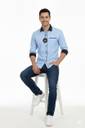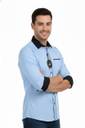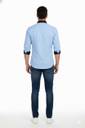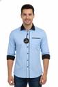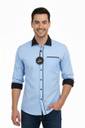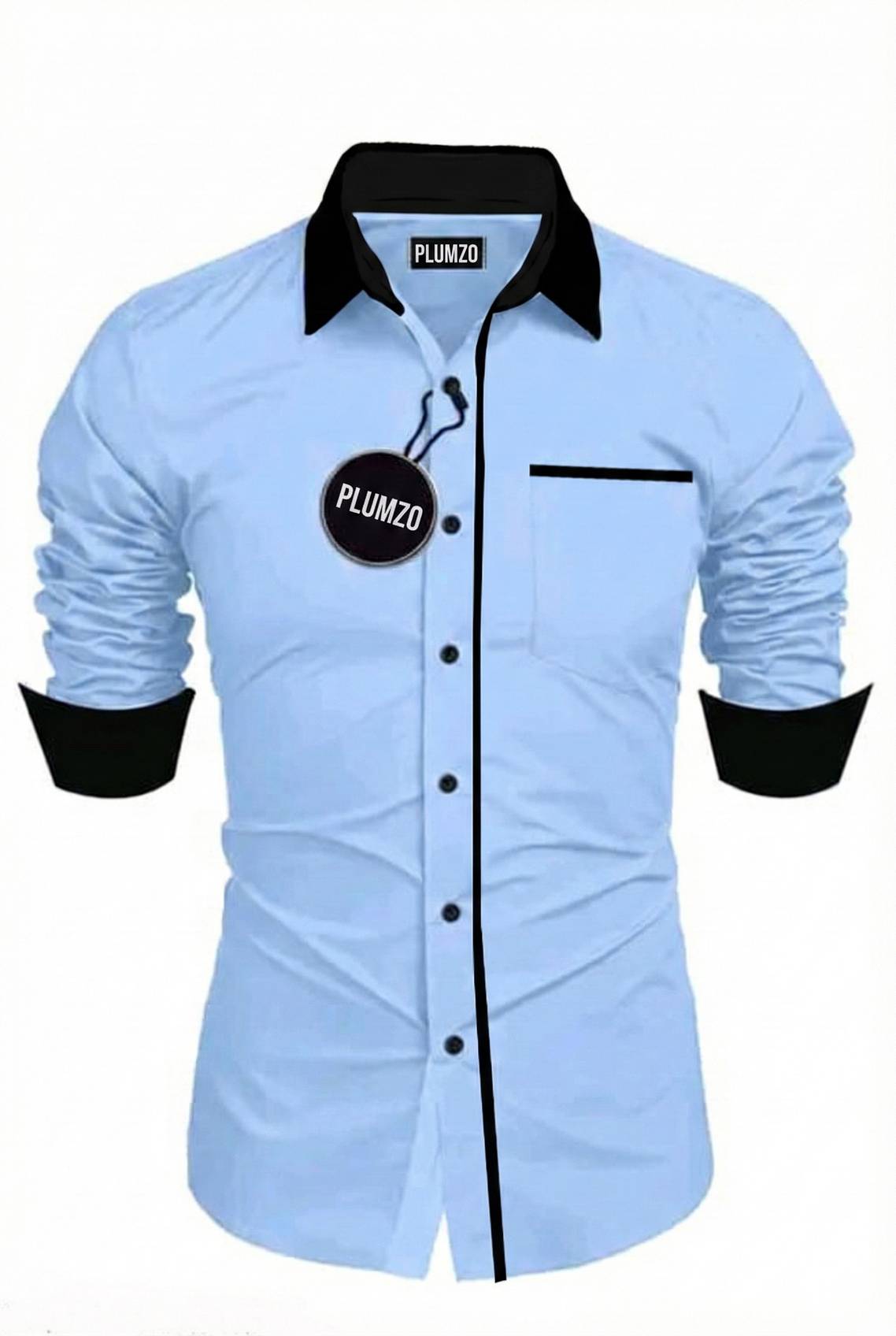 This is a men's full-sleeve red shirt featuring black contrast detailing on the collar, button placket, and cuffs. It has a standard collar and a single chest pocket with black trim. The shirt has a curved hem and appears to have a regular to slim fit. It can be paired with blue or black denim jeans, chinos, or casual trousers.