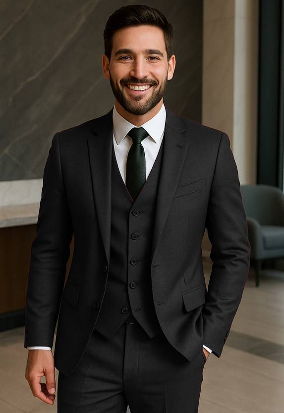 1) Classic black 3-piece suit for men, 2) Versatile and easy to pair with various shirts and accessories, 3) Crafted from high-quality fabric for comfort and durability, 4)4) Perfect for weddings , Parties and special occasions