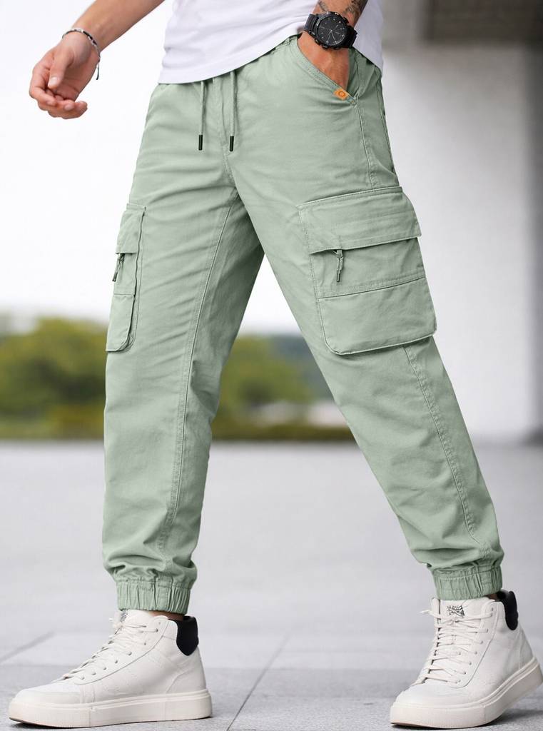 1)Men's Cargo Jogger by Plus91 Brand, 2)Features an elastic waistband for comfortable wear, 3)Multiple pockets for convenient storage, 4)Includes a total of 6 pockets, 5)Combines style and functionality for versatile use