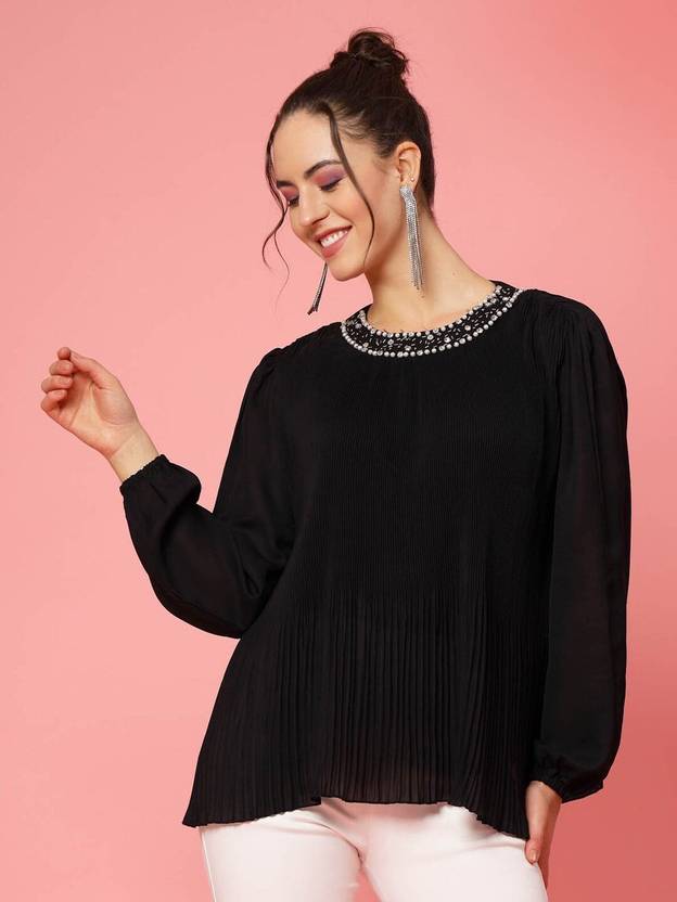 PLUSS Casual Embellished Women Black Top