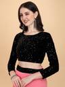The unstitched blouse is adorned with shiny sequins; you can stitch and wear it as you like. The monochrome style gives you an elegant look. Add a heavily sequinned blouse to your wardrobe collection, which you can use with other sarees too. Opt for a back-open tie-up style to rock the look at any party.