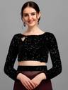 The unstitched blouse is adorned with shiny sequins; you can stitch and wear it as you like. The monochrome style gives you an elegant look. Add a heavily sequinned blouse to your wardrobe collection, which you can use with other sarees too. Opt for a back-open tie-up style to rock the look at any party.