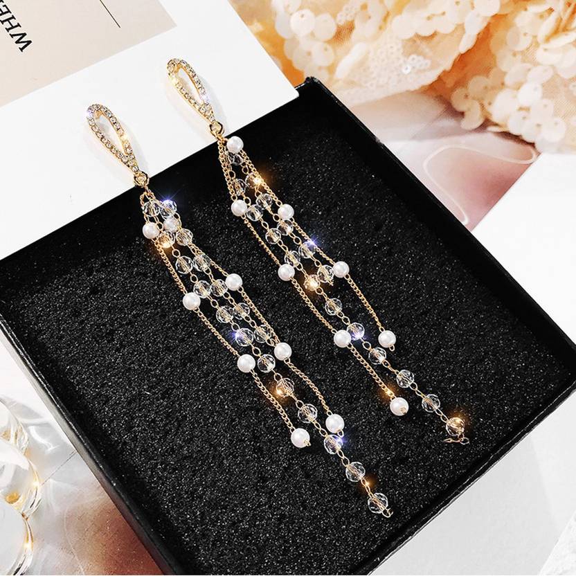 polluxcraft Korean White Pearl Tassels Crystal Studded Ear Cuff Drop Earrings Pearl Alloy Drops & Danglers