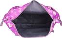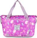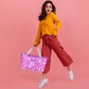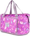 This vibrant blue duffel bag features a playful bow and floral print, adding a touch of charm to everyday use or travel. It includes durable gray handles and a front zip pocket for convenience. The front label reads: