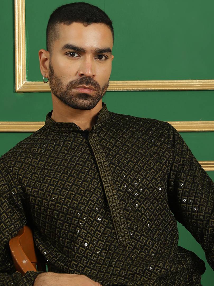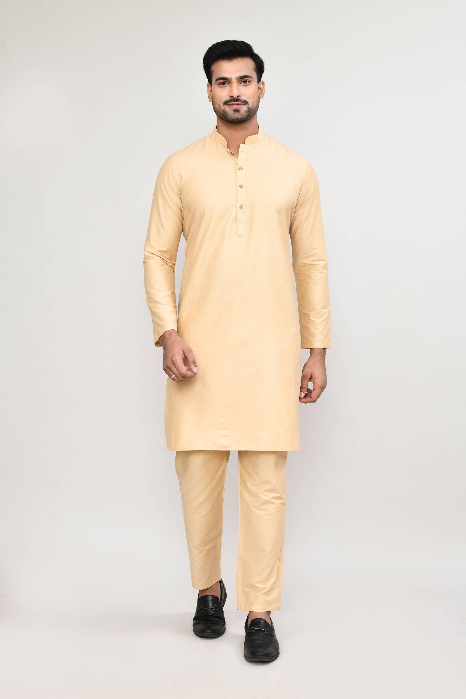 Half Button Placket: With buttons running halfway down the chest for easy wear and a design. Matching Trousers: Creates a monochromatic and cohesive look.