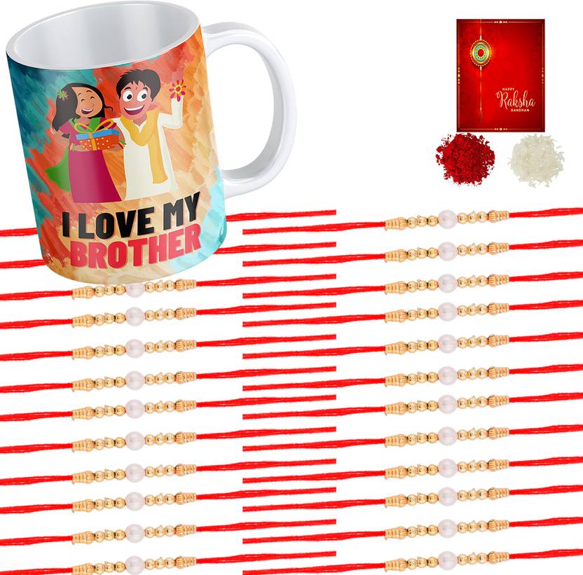 Poorak Designer MG1232_Z_WHITEBEAD-24 Plastic (PVC) Mug Set (24 Rakhi for Brother, 1 Rakhi Mug, 1 Rakhi Card, 1 Roli, 1 Chawal)