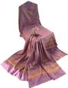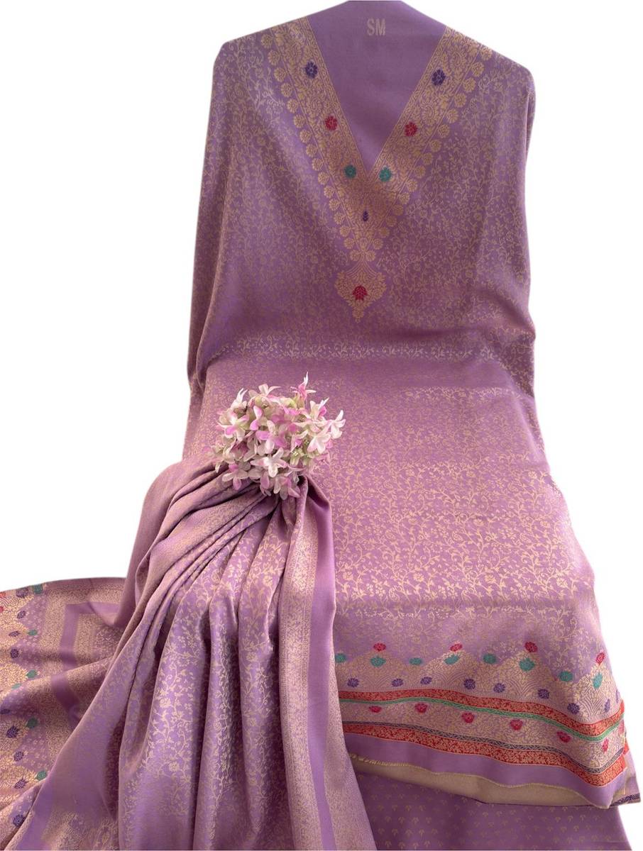 Elevate your ethnic wardrobe with this exquisite unstitched Pure Cashmilon dress material set in a stunning purple shade adorned with intricate gold zari work. The fabric features a sophisticated jacquard pattern that combines traditional motifs with contemporary design elements. The material showcases beautiful geometric patterns and delicate zari detailing throughout, creating a luxurious visual appeal. This unstitched set allows you to customise the fit according to your preferences. The rich brick red base colour is enhanced by the metallic sheen of gold zari work, making it perfect for festive occasions and special events. The fabric's texture and pattern distribution demonstrate superior craftsmanship, while the traditional design elements maintain cultural authenticity. The set includes matching sleeves and additional fabric pieces for complete outfit creation. Being unstitched, it offers flexibility in styling - whether you prefer a classic silhouette or a modern interpretation. The jacquard weave adds durability and a premium feel to the fabric. Hand wash recommended to maintain the fabric's lustre and zari work's brilliance.
