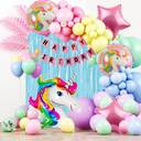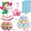 30 multi pastel balloon, 1 unicorn foil balloon, 2 pink heart foil balloon, 2 printed round foil balloon, 1 pink happy birthday banner, 2 blue pastel curtain, 1 glue dot, 1 balloon arch