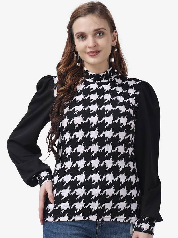 Black & White Solid Print Casual Women Bell Sleeve Top