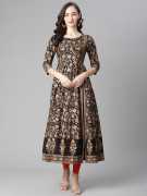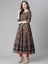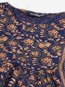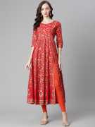 Blue Gold Print Anarkali has Round Neck, three-quarter sleeves, Calf Length with Front slit and Border Hem. Orange Cotton Lycra Legging has Elasticated Waistband.
