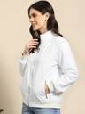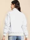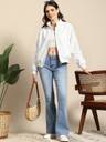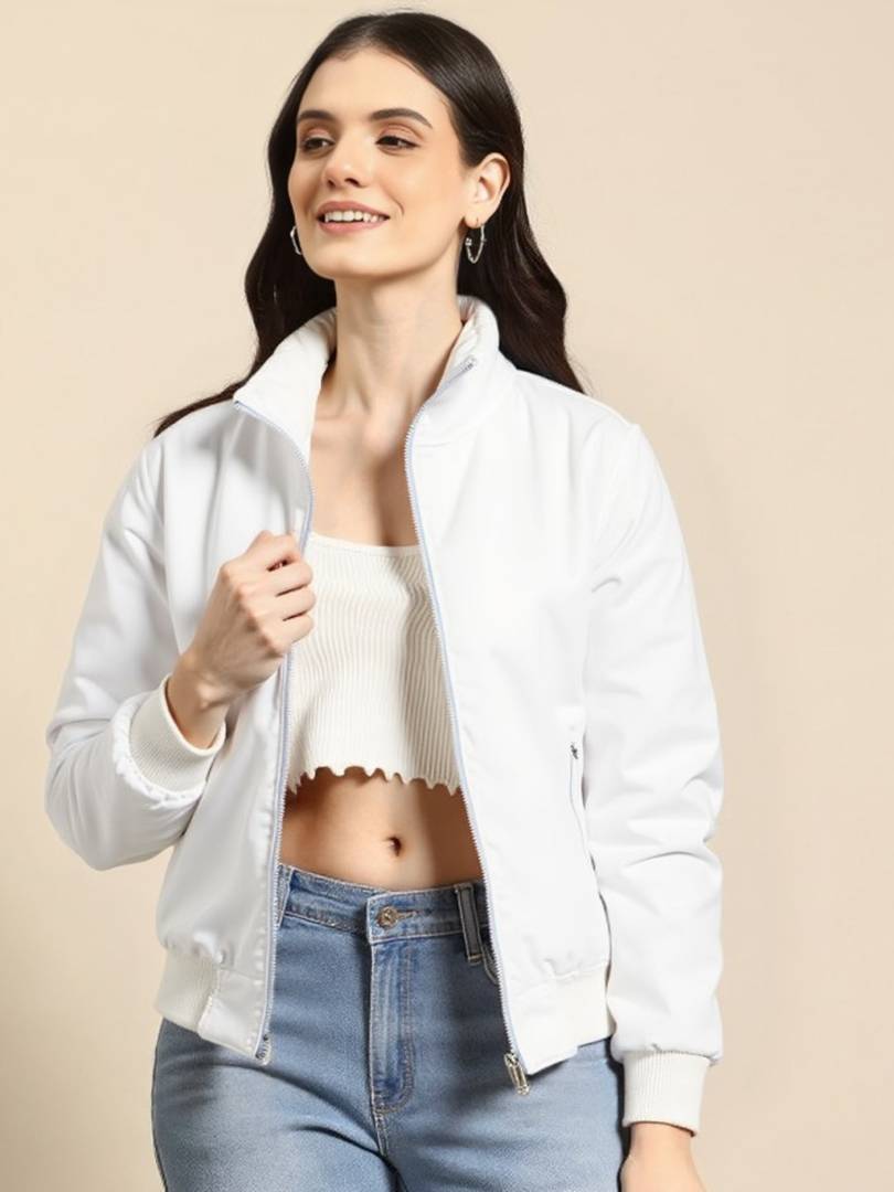 Sporty yet chic, this white bomber jacket blends comfort and contemporary style. Its sleek silhouette makes it a great companion for travel, casual hangouts, or night outings.