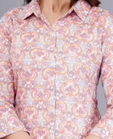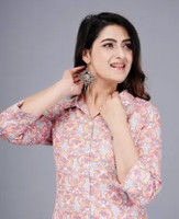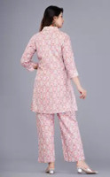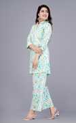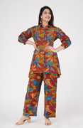 The co-ords set features an intricate Ajrakh print that adds a subtle yet striking detail. This traditional print enhances the overall aesthetic, ensuring a fashionable appearance without compromising on elegance. Its placement on the front panel highlights the craftsmanship involved in creating this set. The regular top length and collared neck make it a convenient and comfortable option for daily wear without inconvenience.