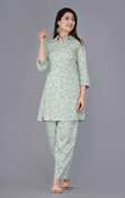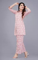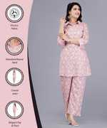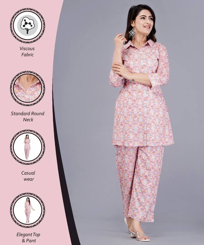 Made from viscose rayon, both the top and bottom offer a comfortable wearing experience. This lightweight fabric allows for ease of movement, making it ideal for all-day wear. Hand wash care instructions maintain the quality and longevity of this set. The material strikes a balance between comfort and style.