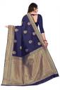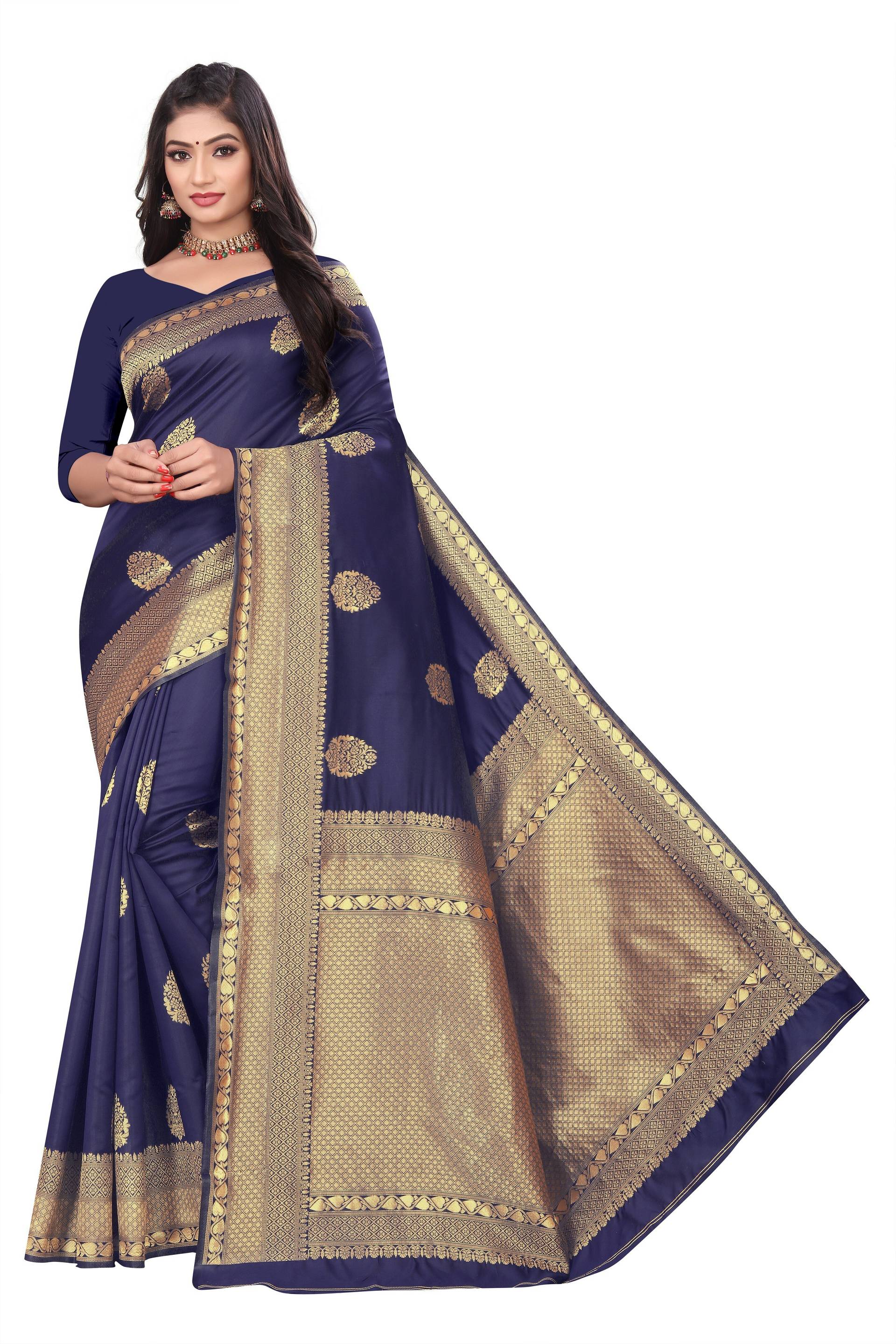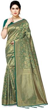 Teal and gold-toned kanjeevaram saree Woven design saree with woven design border Has zari detail. The saree comes with an unstitched blouse piece The blouse worn by the model might be for modelling purpose only. Check the image of the blouse piece to understand how the actual blouse piece looks like. Size & Fit:- Length: 5.5 meters, Material & Care :- Saree Fabric: Silk Blend Blouse Fabric: Silk Blend Dry Clean