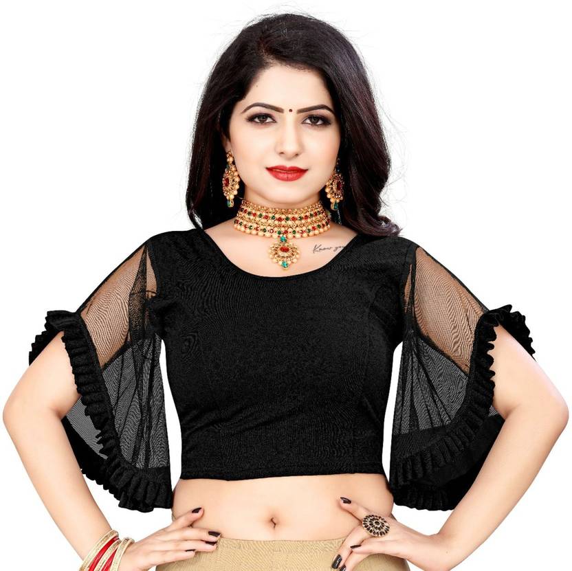 Fabric - Stretchable Soft feel lycra & Net Sleeve. This is a latest designer blouse with frill & Net sleeve, This beautiful blouse can be styled with any color of Saree. Can expect minor color variation due to various reasons.