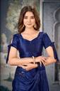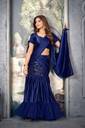 Elegance Redefined: Praveena Designer presents a Navy Blue Net & Satin Ready To Wear Saree that effortlessly combines timeless elegance with contemporary style.